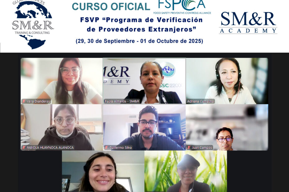 Con excelentes resultados y gran éxito finalizó el Curso Oficial FSPCA – FSVP – Programa de Verificación de Proveedores Extranjeros, en modalidad Online en vivo, con una carga horaria de 12 horas, dirigido a 04… Curso Oficial FSPCA – FSVP – Programa de Verificación de Proveedores Extranjeros – Online – Septiembre 2025
