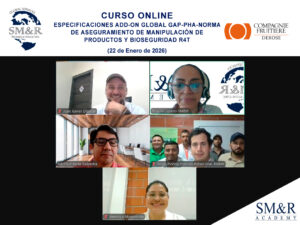Con excelentes resultados y gran éxito finalizó el Curso Especificaciones Add-on GLOBALG.A.P-PHA-Norma de Aseguramiento de Manipulación de Productos y Bioseguridad R4T, en modalidad Online en vivo, exclusivo para 08 colaboradores seleccionados de la empresa DEROSE S.A. (Ecuador), con una carga horaria de 16 horas.